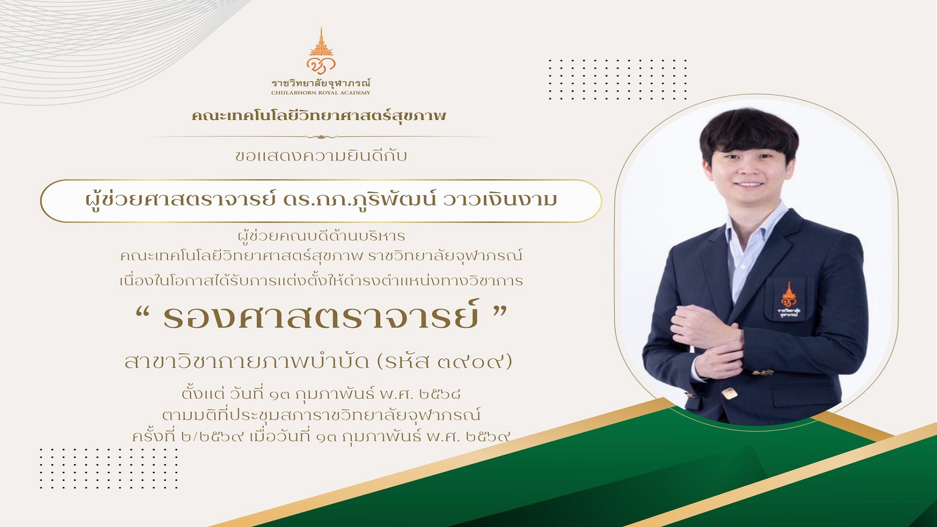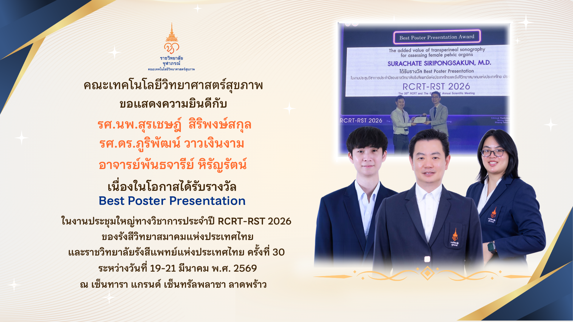 by hst 26/03/2026 คณะเทคโนโลยีวิทยาศาสตร์สุขภาพ คณะเทคโนโลยีวิทยาศาสตร์สุขภาพยินดี กับ ผศ.ดร.ภูริพัฒน์ ได้รับตำแหน่ง “รองศาสตราจารย์” สาขากายภาพบำบัด อ่านเพิ่มเติม..