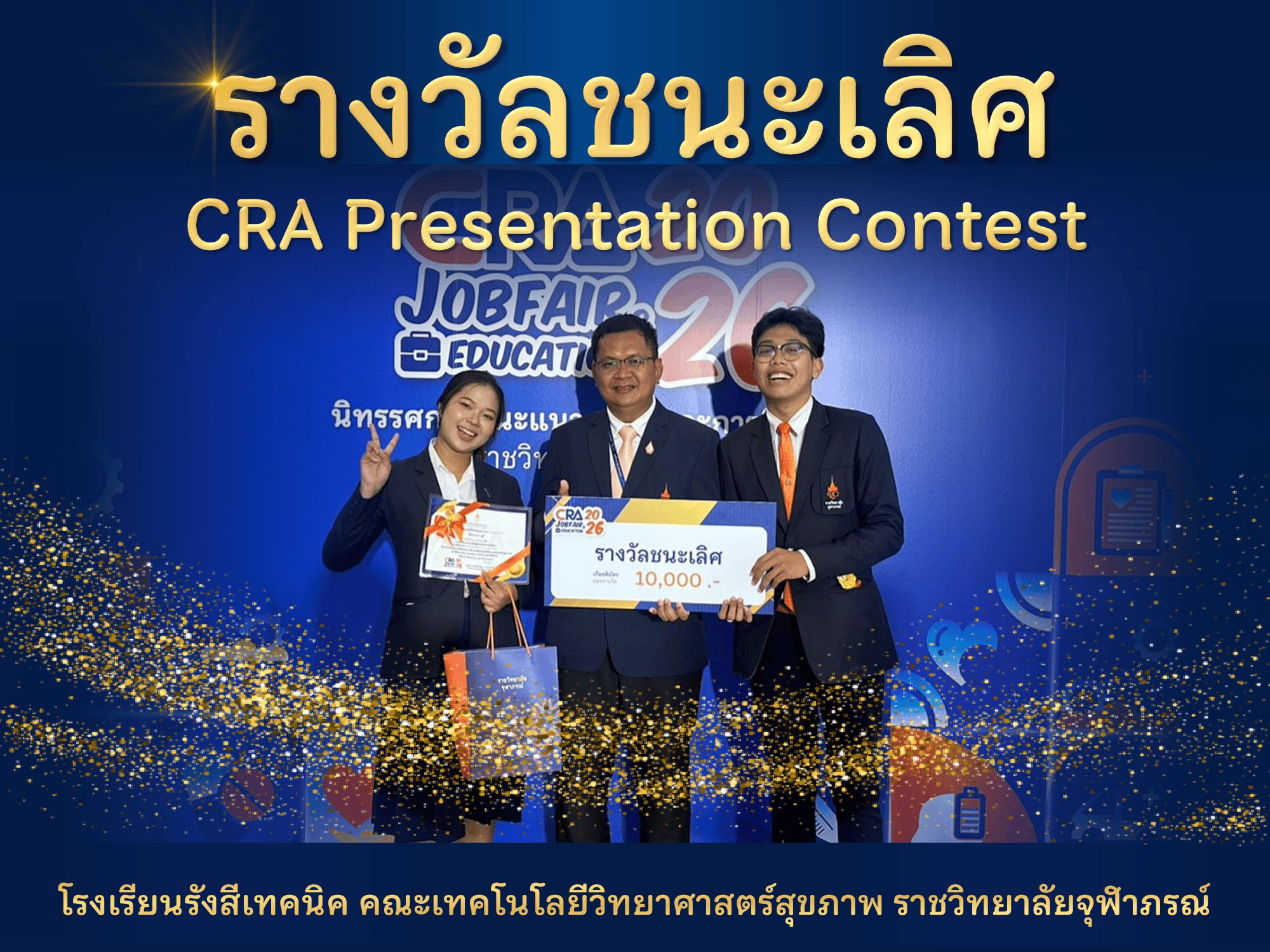 โรงเรียนรังสีเทคนิค ราชวิทยาลัยจุฬาภรณ์ ขอแสดงความยินดีอย่างยิ่งกับ นายนันทภพ บริบูรณ์ และนางสาวพัชราภรณ์ วุฒิ นักศึกษาชั้นปีที่ 2 สาขาวิชารังสีเทคนิค ในโอกาสคว้ารางวัล “ชนะเลิศ” จากการแข่งขัน CRA Presentation Contest ในหัวข้อ “CRA New Gen: Leadership in Health Professionals ผู้นำรุ่นใหม่สายวิทยาศาสตร์สุขภาพ สู่ความเป็นเลิศอย่างยั่งยืน” โดยการแข่งขันรอบชิงชนะเลิศจัดขึ้นเมื่อวันที่ 30 มกราคม 2569 และมีการประกาศผลภายในงาน CRA Job Fair 2026 เมื่อวันที่ 12 กุมภาพันธ์ 2569 ที่ผ่านมา