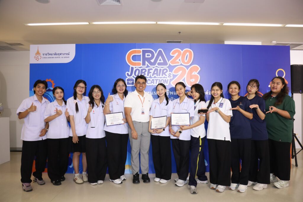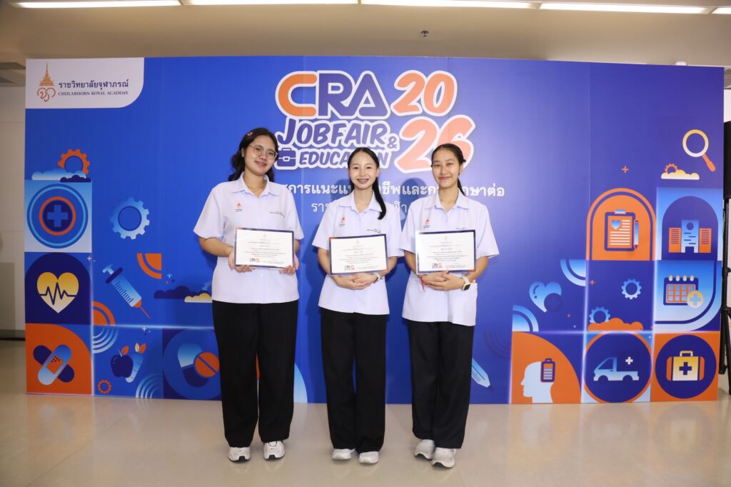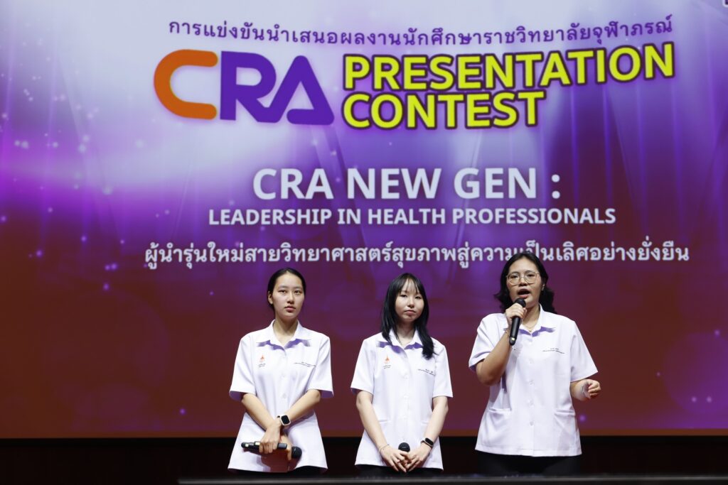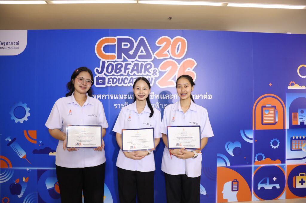 คณะเทคโนโลยีวิทยาศาสตร์สุขภาพ ราชวิทยาลัยจุฬาภรณ์ ขอชื่นชมและให้กำลังใจแก่นางสาวกุศลิน ธีรพงศ์ชูโชค นางสาวสมิตานัน ชัยดี และนางสาวธนาพร คล้ายจีน นักศึกษาชั้นปีที่ 3 สาขาวิชาวิทยาศาสตร์การเคลื่อนไหวและสุขภาพ ในโอกาสเข้าร่วมการแข่งขัน CRA Presentation Contest ภายใต้หัวข้อ “CRA New Gen: Leadership in Health Professionals ผู้นำรุ่นใหม่สายวิทยาศาสตร์สุขภาพ สู่ความเป็นเลิศอย่างยั่งยืน” ซึ่งจัดรอบชิงชนะเลิศเมื่อวันที่ 30 มกราคม 2569 และประกาศผลภายในงาน CRA Job Fair 2026 เมื่อวันที่ 12 กุมภาพันธ์ 2569 ที่ผ่านมา