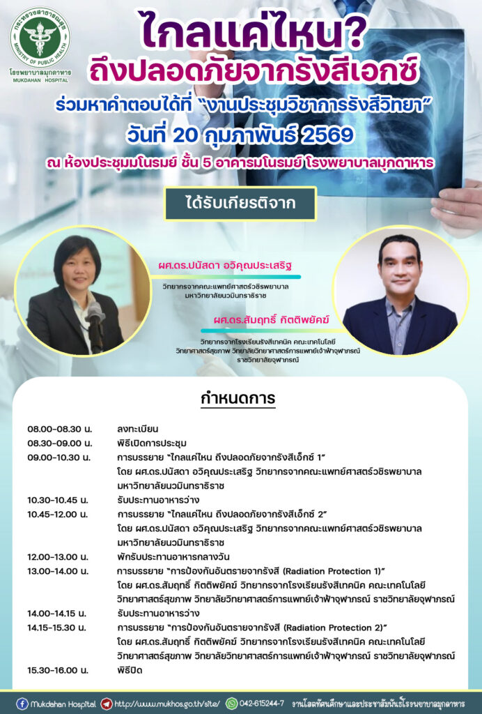 ผศ.ดร.สัมฤทธิ์ กิตติพยัคฆ์ ร่วมเป็นวิทยากรบรรยายด้านความปลอดภัยจากรังสี ณ โรงพยาบาลมุกดาหาร เมื่อวันที่ 20 กุมภาพันธ์ พ.ศ. 2569 ผู้ช่วยศาสตราจารย์ ดร.สัมฤทธิ์ กิตติพยัคฆ์ อาจารย์ประจำโรงเรียนรังสีเทคนิค และรักษาการผู้ช่วยคณบดีด้านกิจการภายนอกและวิเทศสัมพันธ์ คณะเทคโนโลยีวิทยาศาสตร์สุขภาพ ราชวิทยาลัยจุฬาภรณ์ ได้รับเกียรติเป็นวิทยากรบรรยายพิเศษในหัวข้อ “การป้องกันอันตรายจากรังสีสำหรับบุคลากรทางการแพทย์” ในงานประชุมวิชาการรังสีวิทยา ซึ่งจัดขึ้นโดยโรงพยาบาลมุกดาหาร
