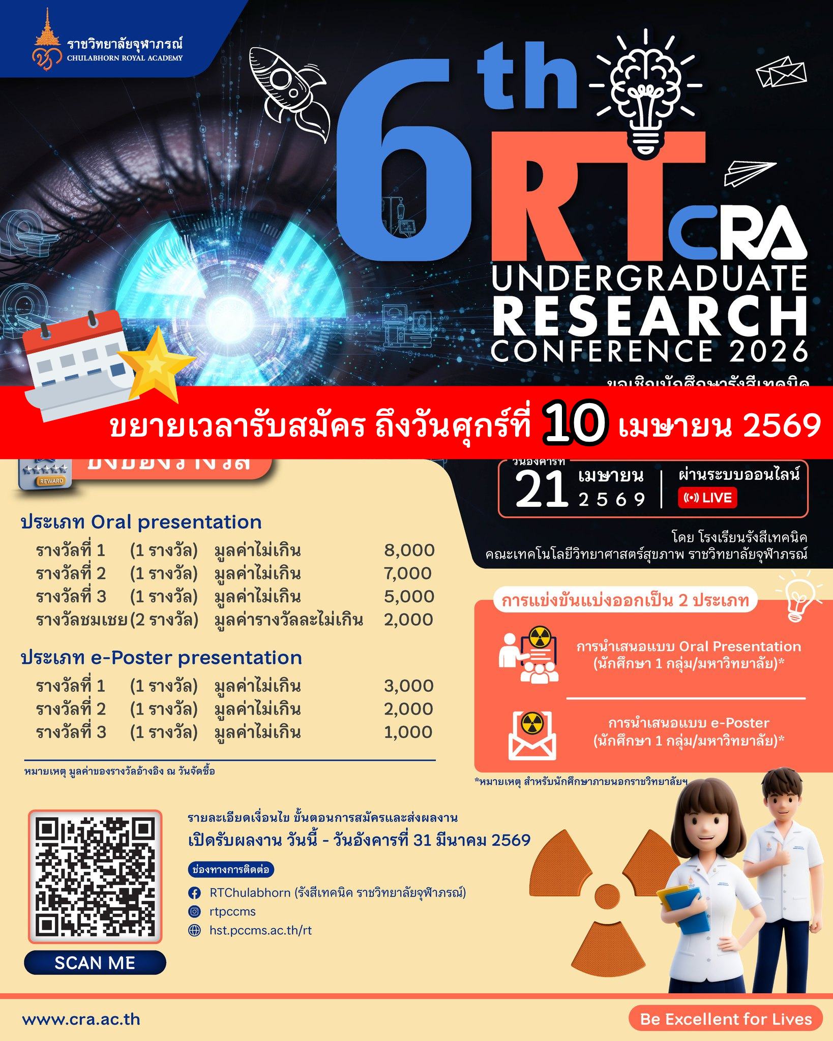 by hst 11/03/2026 Uncategorized ขอเชิญร่วมงานประชุมวิชาการนักศึกษารังสีเทคนิค ครั้งที่ 6 (6th RT-CRA Undergraduate Research Conference 2026) กลับมาอีกครั้งอย่างเป็นทางการกับ “6th RT-CRA Undergraduate Research Conference 2026” เวทีระดับประเทศที่เปิดโอกาสให้นักศึกษารังสีเทคนิคจากทุกสถาบันได้แสดงศักยภาพและแลกเปลี่ยนองค์ความรู้ผ่านผลงานวิจัยอันเข้มข้น โดยในปีนี้กำหนดจัดงานในวันอังคารที่ 21 เมษายน 2569 ในรูปแบบออนไลน์ เพื่อเชื่อมโยงเครือข่ายวิชาการรังสีเทคนิคให้กว้างไกลกว่าที่เคยขอเชิญชวนน้องๆ นักศึกษาร่วมส่งผลงานเข้าประกวดใน 2 ประเภท ได้แก่ การนำเสนอภาคบรรยาย (Oral Presentation) และ การนำเสนอแบบ e-Poster (จำกัดสิทธิ์ประเภทละ 1 กลุ่มต่อสถาบัน สำหรับนักศึกษาภายนอกราชวิทยาลัยฯ) ชิงเงินรางวัลพร้อมประกาศนียบัตรรับรองทุกกลุ่ม เปิดรับสมัครและส่งผลงานได้ตั้งแต่วันนี้ จนถึงวันที่ 31 มีนาคม 2569 ผู้ที่สนใจสามารถศึกษารายละเอียดเพิ่มเติมและลงทะเบียนผ่าน QR Code หรือลิงก์ แล้วพบกันในวันงานเพื่อร่วมรับชมสุดยอดผลงานวิชาการจากอนาคตของวิชาชีพไทย https://hst.cra.ac.th/s/GT38r6 Views: 241