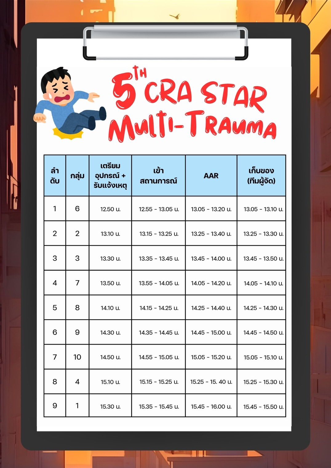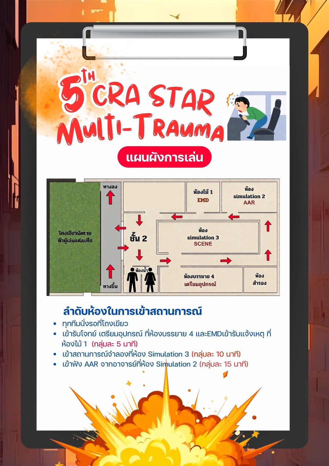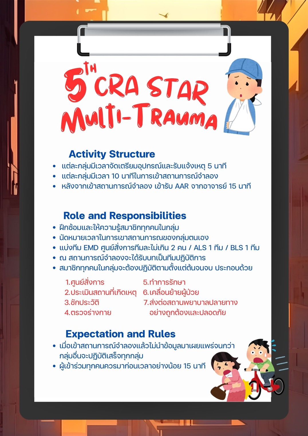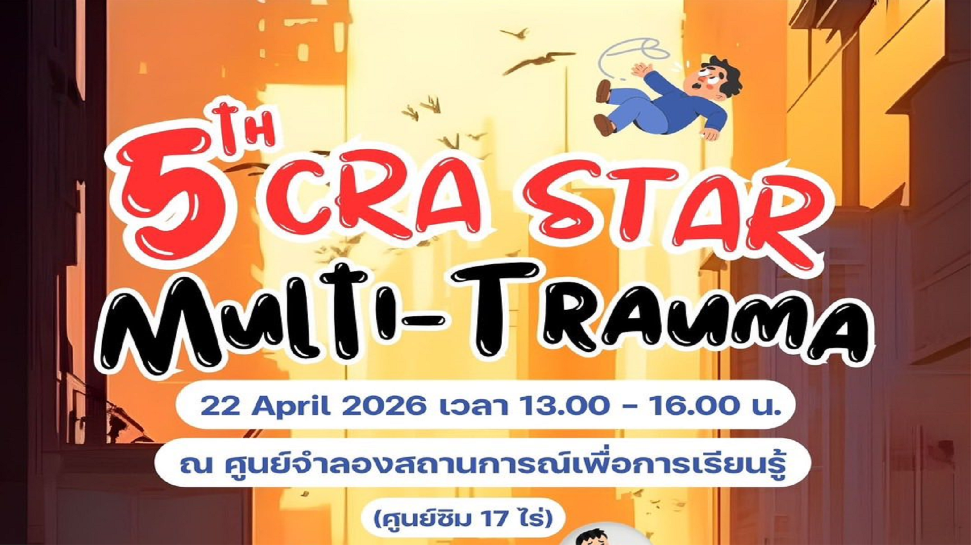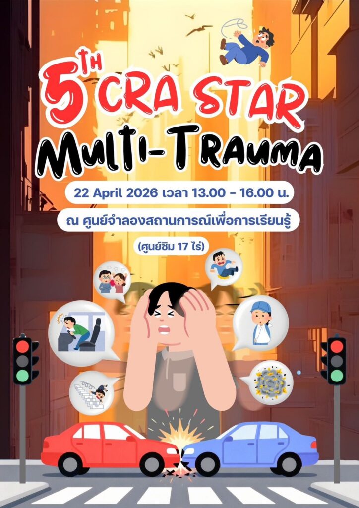 กิจกรรม 5th CRA Star ซึ่งเป็นเวทีสำหรับการทดสอบและพัฒนาทักษะการคิดวิเคราะห์ การตัดสินใจ และการทำงานเป็นทีม ผ่านสถานการณ์จำลองด้านผู้ป่วย Multi Trauma ที่ออกแบบให้สอดคล้องกับสถานการณ์ฉุกเฉินจริง ผู้เข้าร่วมจะได้ฝึกการประเมินผู้ป่วยอย่างเป็นระบบ การวางแผนการดูแลรักษา และการสื่อสารในทีมสหสาขาวิชาชีพอย่างมีประสิทธิภาพ กิจกรรมจัดขึ้นในวันที่ 22 เมษายน 2569 เวลา 13.00–16.00 น. ณ ศูนย์ซิม 17 ไร่ โดยขอความร่วมมือผู้เข้าร่วมทุกท่านมาถึงก่อนเวลาอย่างน้อย 15 นาที เพื่อเตรียมความพร้อมก่อนเริ่มกิจกรรม และโปรดนำอุปกรณ์ส่วนตัว ได้แก่ หูฟังแพทย์ และนาฬิกา มาด้วย