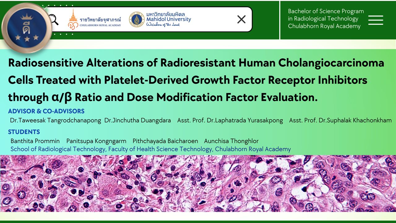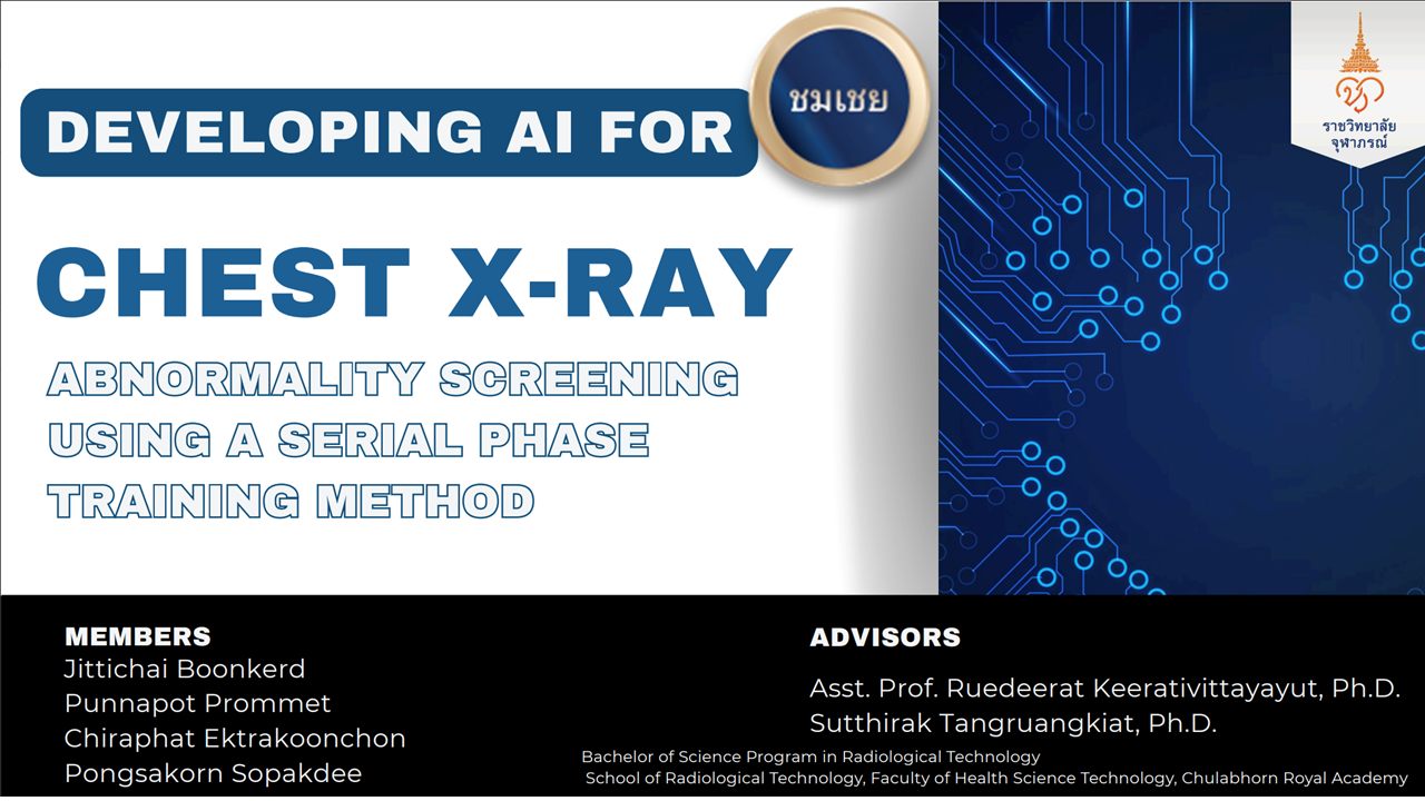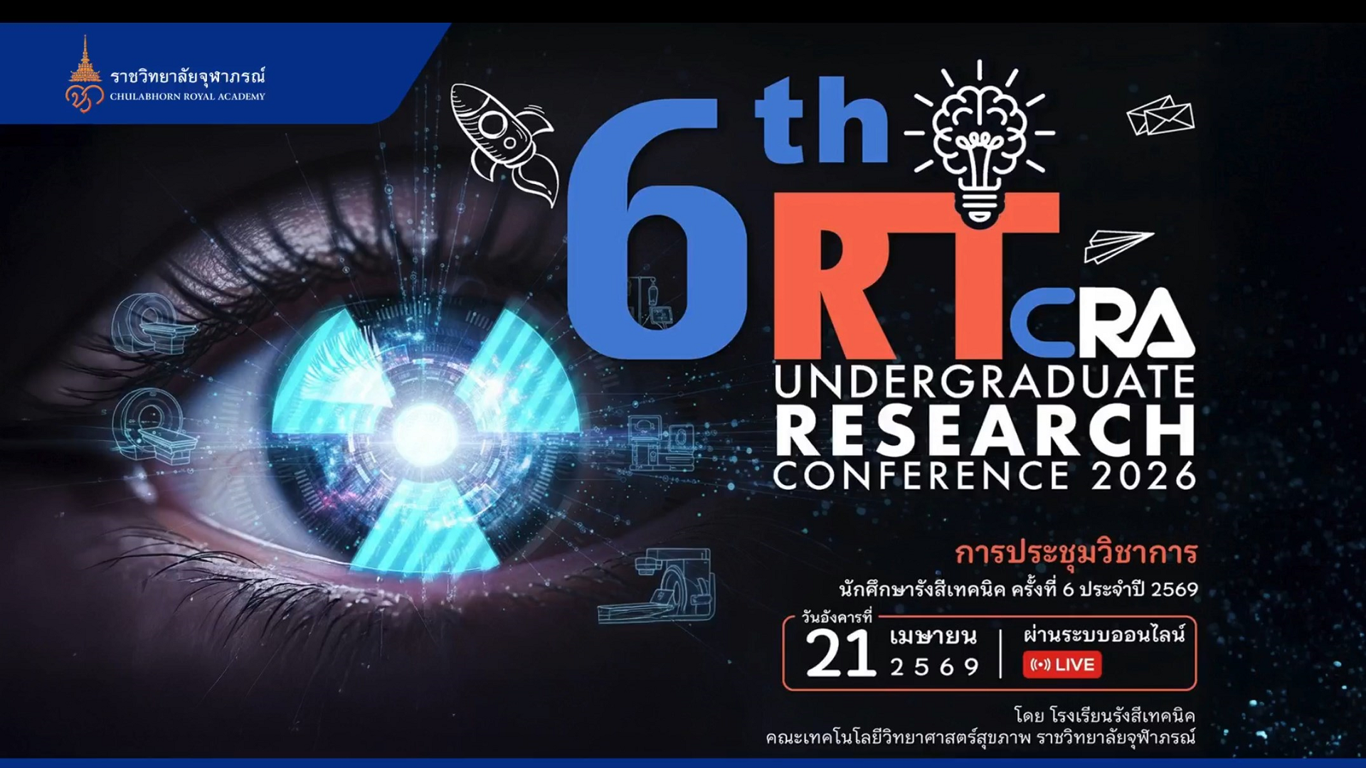 โรงเรียนรังสีเทคนิค ราชวิทยาลัยจุฬาภรณ์ ขอประกาศผลการแข่งขันประเภท Oral Presentation ในการประชุมวิชาการนักศึกษารังสีเทคนิค ประจำปี 2569 (6th RT-CRA Undergraduate Research Conference 2026) พร้อมขอแสดงความยินดีกับนักศึกษาทุกสถาบันที่เข้าร่วมและนำเสนอผลงานวิชาการอันทรงคุณค่า ทั้งนี้ ขอขอบพระคุณคณะกรรมการผู้ทรงคุณวุฒิ ได้แก่ รศ.ดร.สุชาติ โกทันย์ ผศ.ดร.จีรศักดิ์ คำฟองเครือ และ ผศ.ดร.ดุษฎี สุทโธ สำหรับการพิจารณาตัดสินผลงาน โดยรางวัลชนะเลิศ ได้แก่ ผลงานเรื่อง Morphometry of the Proximal Femur and Factors Affecting Its Alterations in Conventional Radiography: A Skeletal Study of the Northeastern Thai Population จากมหาวิทยาลัยขอนแก่น รองชนะเลิศอันดับ 1 ได้แก่ ผลงานเรื่อง An Evaluation of GoogleTM-Based Artificial Intelligence’s Diagnostic Performance in Detecting Pulmonary Tuberculosis on Chest Radiographs จากมหาวิทยาลัยนวมินทราธิราช รองชนะเลิศอันดับ 2 ได้แก่ ผลงานเรื่อง Radiosensitive alterations of radioresistant human cholangiocarcinoma cells treated with Platelet-Derived Growth Factor Receptor inhibitors through α/β ratio and Dose Modification Factor evaluation จากราชวิทยาลัยจุฬาภรณ์ และรางวัลชมเชย ได้แก่ ผลงานเรื่อง Developing AI for Chest X-ray Abnormality Screening Using a Serial Phase Training Method และผลงานเรื่อง The study of Platelet-Derived Growth Factor Receptor (PDGFR) expression in determining radiosensitivity of human cholangiocarcinoma cells จากราชวิทยาลัยจุฬาภรณ์