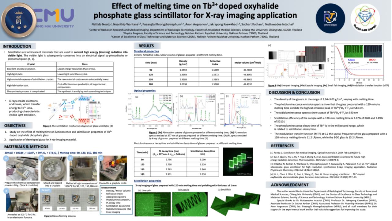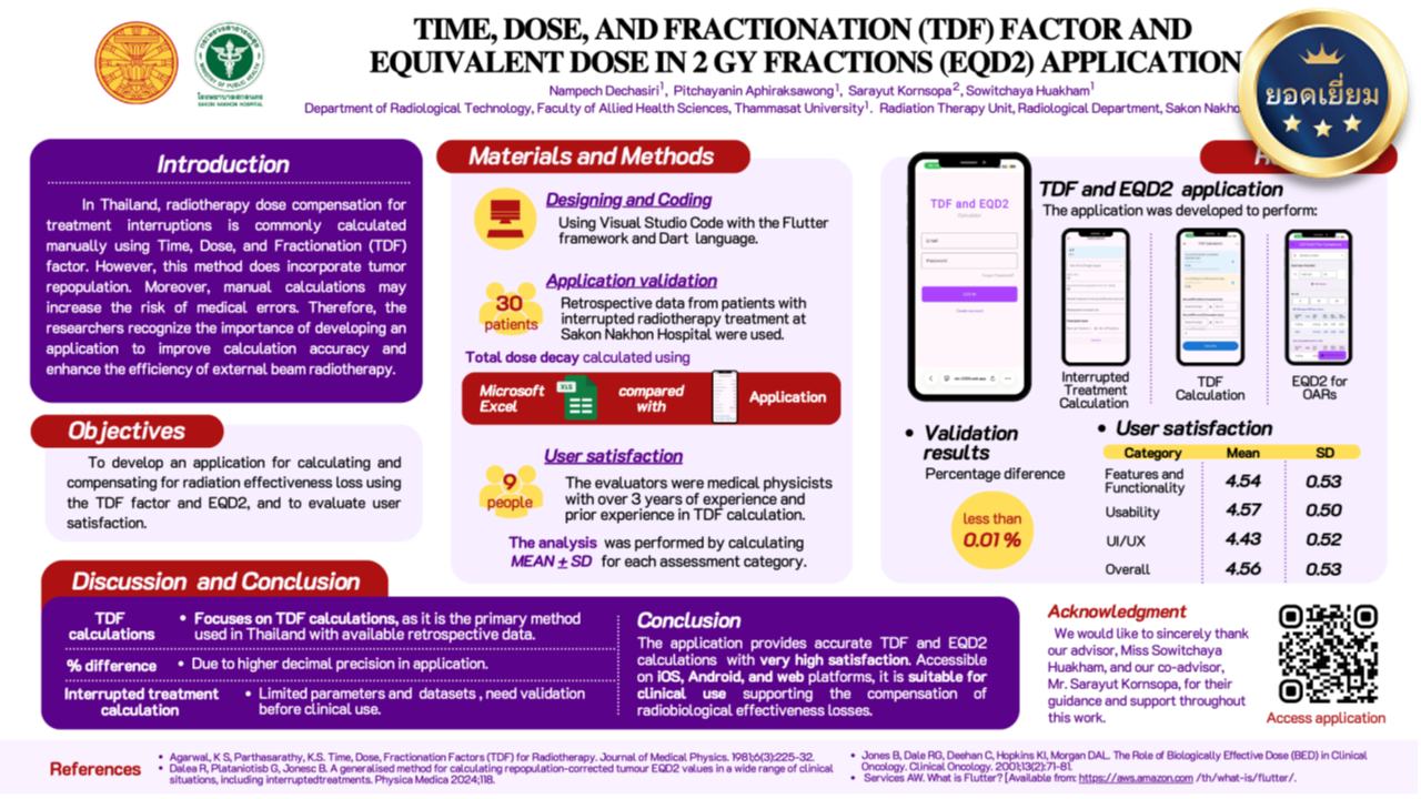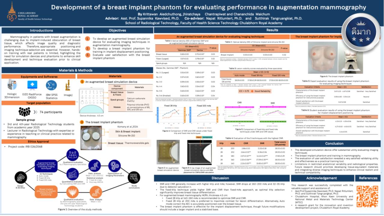 ในส่วนของการแข่งขันประเภท e-Poster Presentation โรงเรียนรังสีเทคนิค ราชวิทยาลัยจุฬาภรณ์ ขอขอบพระคุณคณะกรรมการผู้ทรงคุณวุฒิ ได้แก่ รศ.ดร.นันทวัฒน์ อู่ดี ผศ.ดร.ธวัชชัย ปราบศัตรู และ อ.ดร.อนุชา ชัยชนะ สำหรับการประเมินผลงาน โดยรางวัลชนะเลิศ ได้แก่ ผลงานเรื่อง Time, Dose and Fractionation (TDF) factor and Equivalent Dose in 2 Gy Fractions (EQD2) application จากมหาวิทยาลัยธรรมศาสตร์ รองชนะเลิศอันดับ 1 ได้แก่ ผลงานเรื่อง Development of a breast implant phantom for evaluating performance in augmentation mammography จากราชวิทยาลัยจุฬาภรณ์ และรองชนะเลิศอันดับ 2 ได้แก่ ผลงานเรื่อง Effect of melting time on Tb3+ doped oxyhalide phosphate glass scintillator for x-ray imaging application จากมหาวิทยาลัยเชียงใหม่ ซึ่งสะท้อนถึงศักยภาพและความก้าวหน้าทางวิชาการของนักศึกษารังสีเทคนิคได้อย่างโดดเด่น