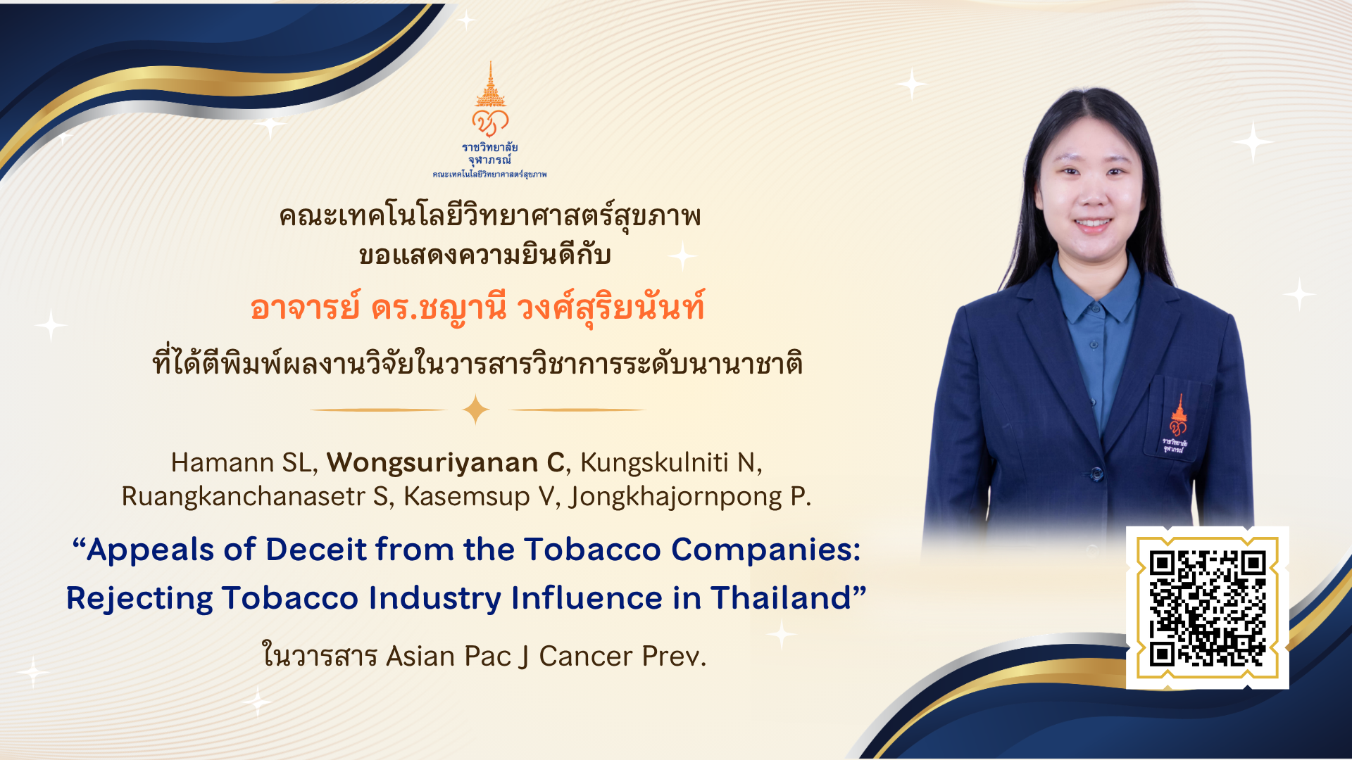 ผลงานวิจัยเรื่อง “Appeals of deceit from the tobacco companies: Rejecting tobacco industry influence in Thailand.” ได้รับการตีพิมพ์ในวารสาร Asian Pacific Journal of Cancer Prevention ซึ่งเป็นวารสารชั้นนำที่ได้รับการยอมรับอย่างกว้างขวางในระดับนานาชาติ อันเป็นเครื่องชี้วัดคุณภาพงานวิจัยในระดับสูงสุด