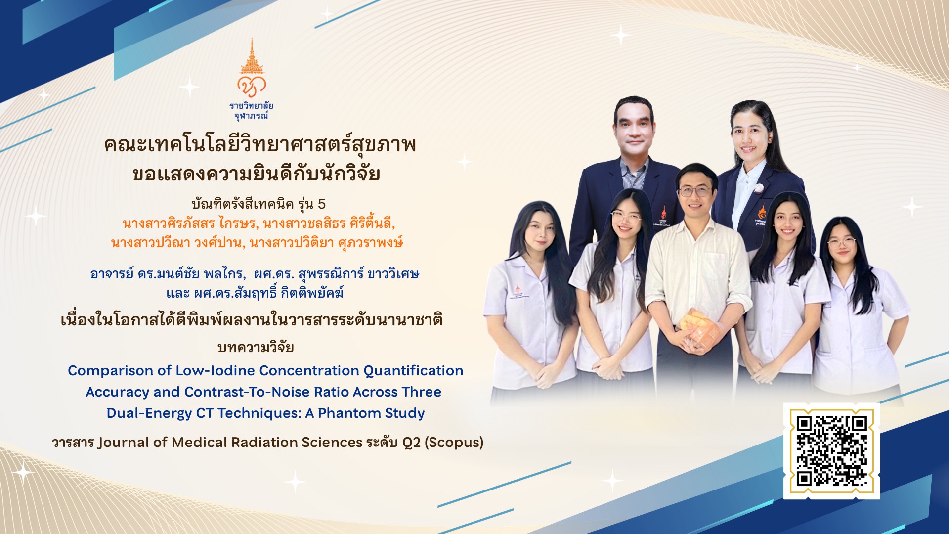 ขอแสดงความชื่นชมและยินดีอย่างสูงสุดกับ อาจารย์ ดร.นายแพทย์วิทยา สังขรัตน์ ในโอกาสที่ผลงานของท่านได้รับการตอบรับให้ตีพิมพ์ในวารสารวิชาการระดับนานาชาติชั้นนำในฐานข้อมูล Q1 นับเป็นเกียรติประวัติอันงดงามและเป็นก้าวสำคัญในเส้นทางของการสร้างองค์ความรู้ทางวิชาการ ผลงานวิจัยเรื่อง “Preserved motion perception and the density of cortical projections to V5 in homonymous hemianopia” ได้รับการตีพิมพ์ในวารสาร Brain Communications ซึ่งเป็นวารสารชั้นนำที่ได้รับการยอมรับอย่างกว้างขวางในระดับนานาชาติ โดยอยู่ในฐานข้อมูล Q1 อันเป็นเครื่องชี้วัดคุณภาพงานวิจัยในระดับสูงสุด...