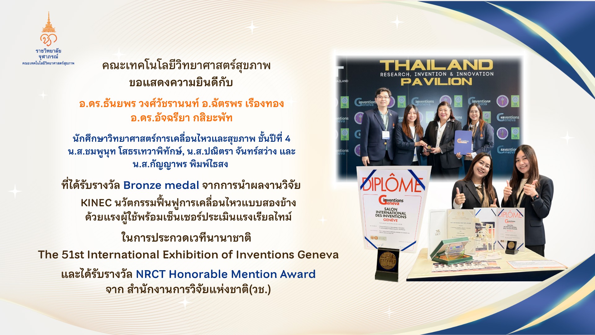 ขอแสดงความชื่นชมยินดีอย่างยิ่ง แด่ อาจารย์ ดร.ธันยพร วงศ์วัชรานนท์, อาจารย์ฉัตรพร เรืองทอง และ อาจารย์ ดร.อัจฉรียา กสิยะพัท และนักศึกษาวิทยาศาสตร์การเคลื่อนไหวและสุขภาพ ชั้นปีที่ 4 ได้แก่ นางสาวชมพูนุท โสธรเทวาพิทักษ์, นางสาวปณิตรา จันทร์สว่าง และ นางสาวกัญญาพร พิมพ์ไธสง ในโอกาสที่ได้รับเกียรติให้รับรางวัล Bronze Medal จากการนำเสนอผลงานวิจัยหัวข้อ “KINEC นวัตกรรมฟื้นฟูการเคลื่อนไหวแบบสองข้างด้วยแรงผู้ใช้พร้อมเซ็นเซอร์ประเมินแรงเรียลไทม์” ภายในงานประชุมวิชาการระดับนานาชาติ...