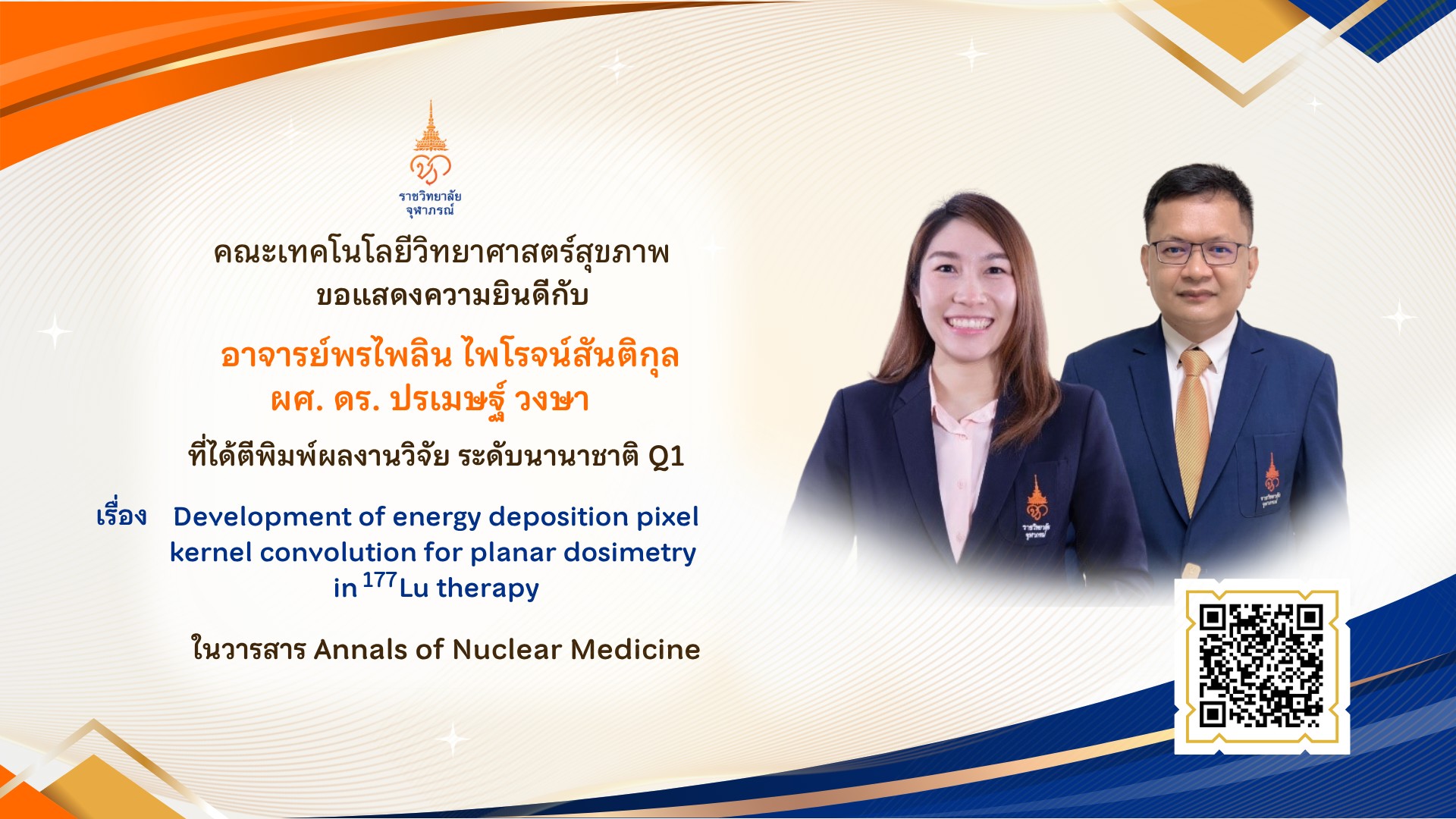 ขอแสดงความชื่นชมและยินดีอย่างสูงสุดกับ อาจารย์พรไพลิน ไพโรจน์สันติกุล และ ผู้ช่วยศาสตราจารย์ ดร.ปรเมษฐ์ วงษา ในโอกาสที่ผลงานของท่านได้รับการตอบรับให้ตีพิมพ์ในวารสารวิชาการระดับนานาชาติชั้นนำในฐานข้อมูล Q1 นับเป็นเกียรติประวัติอันงดงามและเป็นก้าวสำคัญในเส้นทางของการสร้างองค์ความรู้ทางวิชาการ ผลงานวิจัยเรื่อง “Development of energy deposition pixel kernel convolution for planar dosimetry in ¹⁷⁷Lu therapy” ได้รับการตีพิมพ์ในวารสาร Annals of Nuclear Medicine...