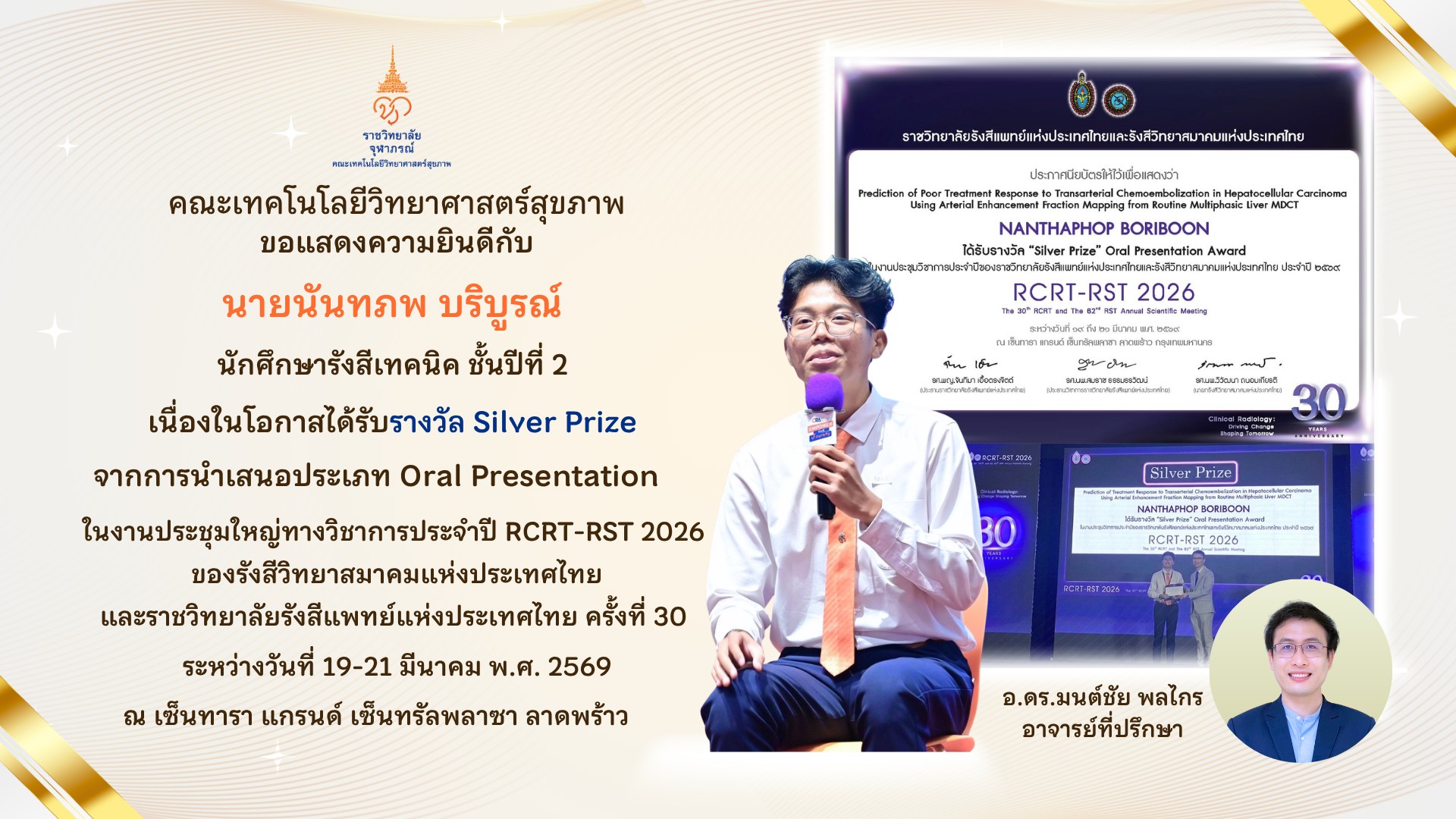 ขอแสดงความชื่นชมและยินดีอย่างสูงสุดกับ นายนันทภพ บริบูรณ์ นักศึกษาสาขาวิชารังสีเทคนิค ชั้นปีที่ 2 ในโอกาสที่ผลงานวิจัยของท่านได้รับเกียรติให้รับรางวัล Silver Prize จากการนำเสนอผลงานวิจัยหัวข้อ “Prediction of poor treatment response to transarterial chemoembolization in hepatocellular carcinoma using arterial enhancement fraction mapping from routine multiphase...