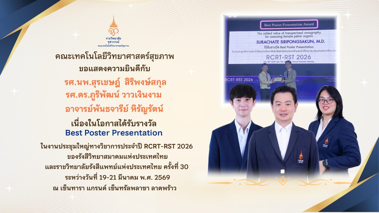 ขอแสดงความชื่นชมและยินดีอย่างสูงสุดกับ รองศาสตราจารย์ นพ.สุรเชษฎ์ สิริพงษ์สกุล, รองศาสตราจารย์ ดร.ภูริพัฒน์ วาวเงินงาม และ อาจารย์พันธจารีย์ หิรัญรัตน์ ในโอกาสที่ผลงานวิจัยของท่านได้รับเกียรติให้รับรางวัล Best Poster Presentation จากการนำเสนอผลงานวิจัยหัวข้อ “The added value of transperineal sonography for assessing female pelvic organs” ภายในงานประชุมวิชาการ RCRT–RST 2026...