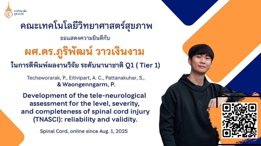 ขอแสดงความชื่นชมและยินดีอย่างสูงสุดกับ ผู้ช่วยศาสตราจารย์ ดร.ภูริพัฒน์ วาวเงินงาม ในโอกาสที่ผลงานของท่านได้รับการตอบรับให้ตีพิมพ์ในวารสารวิชาการระดับนานาชาติชั้นนำในฐานข้อมูล Q1 นับเป็นเกียรติประวัติอันงดงามและเป็นก้าวสำคัญในเส้นทางของการสร้างองค์ความรู้ทางวิชาการ ผลงานวิจัยเรื่อง “Development of the tele-neurological assessment for the level, severity, and completeness of spinal cord injury (TNASCI): Reliability and validity” ได้รับการตีพิมพ์ในวารสาร Spinal...