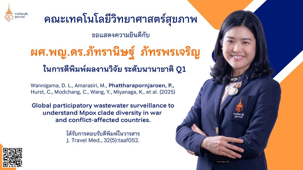 ขอแสดงความชื่นชมและยินดีอย่างสูงสุดกับ ผู้ช่วยศาสตราจารย์ แพทย์หญิง ดร.ภัทรานิษฐ์ ภัทรพรเจริญ ในโอกาสที่ผลงานของท่านได้รับการตอบรับให้ตีพิมพ์ในวารสารวิชาการระดับนานาชาติชั้นนำในฐานข้อมูล Q1 นับเป็นเกียรติประวัติอันงดงามและเป็นก้าวสำคัญในเส้นทางของการสร้างองค์ความรู้ทางวิชาการ ผลงานวิจัยเรื่อง “Global participatory wastewater surveillance to understand mpox clade diversity in war and conflict-affected countries” ได้รับการตีพิมพ์ในวารสาร Journal of Travel Medicine ซึ่งเป็นวารสารชั้นนำที่ได้รับการยอมรับอย่างกว้างขวางในระดับนานาชาติ...