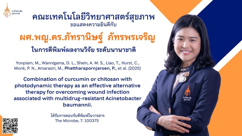 ขอแสดงความชื่นชมและยินดีอย่างสูงสุดกับ ผู้ช่วยศาสตราจารย์ แพทย์หญิง ดร.ภัทรานิษฐ์ ภัทรพรเจริญ ในโอกาสที่ผลงานของท่านได้รับการตอบรับให้ตีพิมพ์ในวารสารวิชาการระดับนานาชาติ นับเป็นเกียรติประวัติอันงดงามและเป็นก้าวสำคัญในเส้นทางของการสร้างองค์ความรู้ทางวิชาการ ผลงานวิจัยเรื่อง “Combination of curcumin or chitosan with photodynamic therapy as an effective alternative therapy for overcoming wound infection associated with multidrug-resistant Acinetobacter...