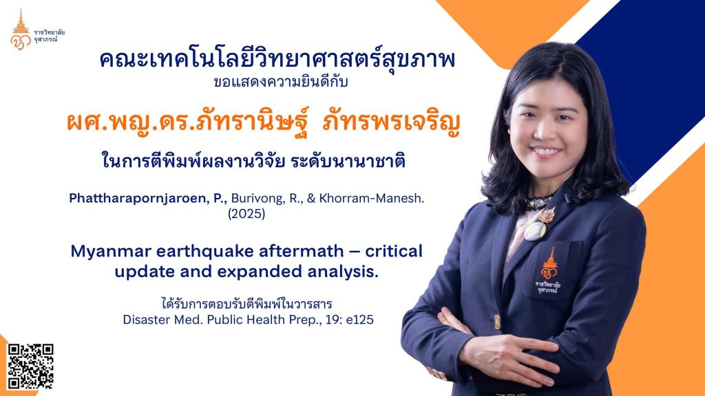 ขอแสดงความชื่นชมและยินดีอย่างสูงสุดกับ ผู้ช่วยศาสตราจารย์ แพทย์หญิง ดร.ภัทรานิษฐ์ ภัทรพรเจริญ ในโอกาสที่ผลงานของท่านได้รับการตอบรับให้ตีพิมพ์ในวารสารวิชาการระดับนานาชาติ นับเป็นเกียรติประวัติอันงดงามและเป็นก้าวสำคัญในเส้นทางของการสร้างองค์ความรู้ทางวิชาการ ผลงานวิจัยเรื่อง “Myanmar earthquake aftermath – Critical update and expanded analysis” ได้รับการตีพิมพ์ในวารสาร Disaster Medicine and Public Health Preparedness ซึ่งเป็นวารสารชั้นนำที่ได้รับการยอมรับอย่างกว้างขวางในระดับนานาชาติ อันเป็นเครื่องชี้วัดคุณภาพงานวิจัยในระดับสูงสุด ความสำเร็จอันทรงคุณค่านี้นับเป็นความภาคภูมิใจอันยิ่งใหญ่ของคณะฯ ที่ได้เห็นคณาจารย์ของเราสร้างบทบาทอันโดดเด่นในเวทีวิชาการระดับสากล พร้อมทั้งผลักดันองค์ความรู้ใหม่ๆ...