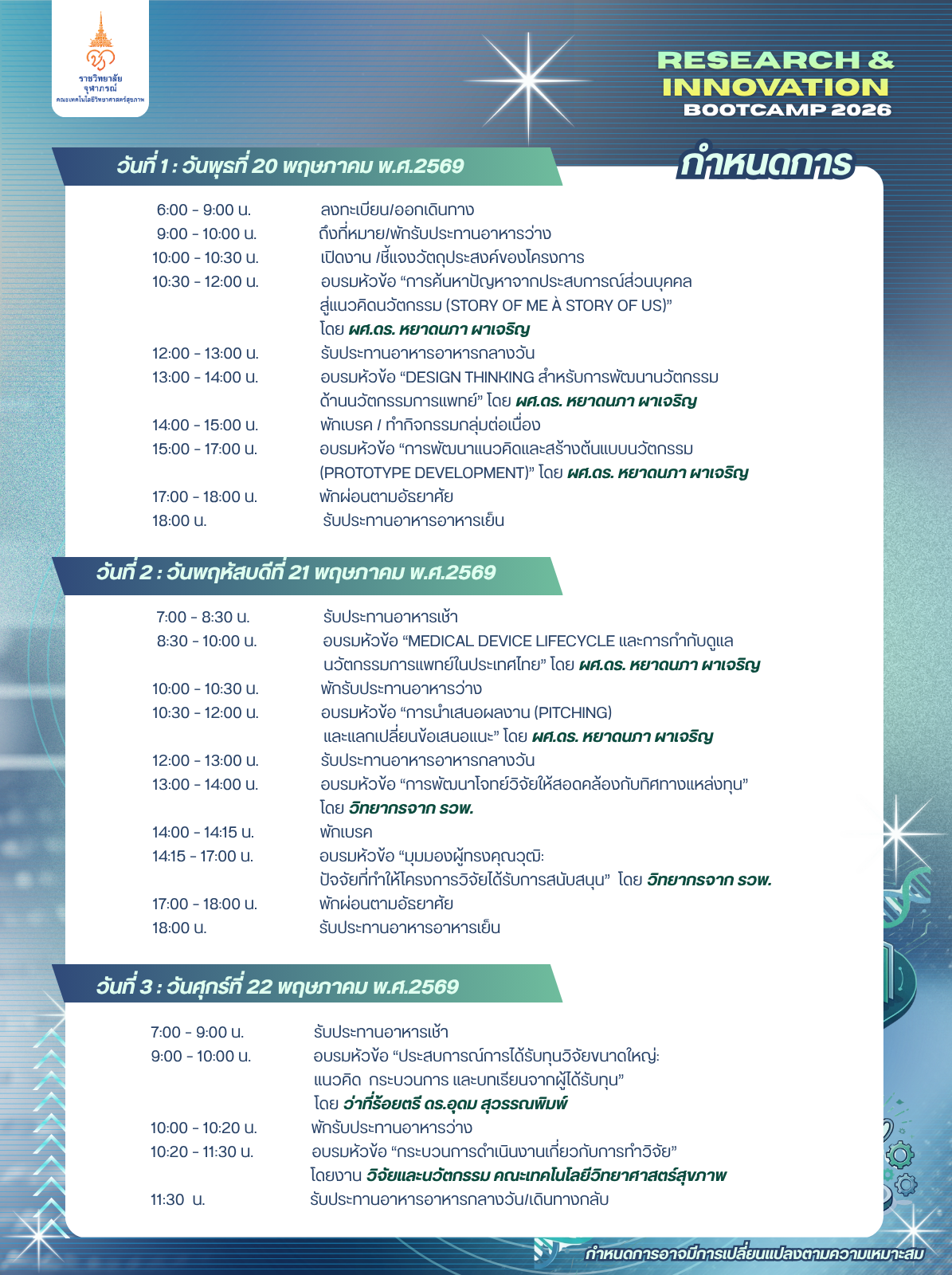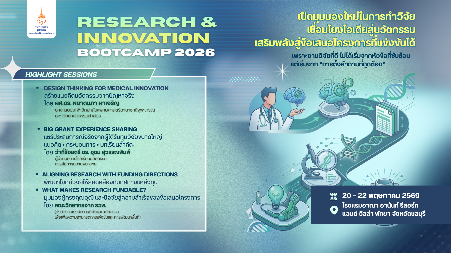 ฝ่ายวิจัยและนวัตกรรม คณะเทคโนโลยีวิทยาศาสตร์สุขภาพ มีแผนจัด โครงการเสริมสร้างสมรรถนะวิจัยเเละนวัตกรรมสู่การปฏิบัติจริง (Bootcamp) โดยมีวัตถุประสงค์เพื่อเปิดมุมมองใหม่ในการทำวิจัย เชื่อมโยงไอเดียสู่วัตกรรม และเสริมพลังสู่ข้อเสนอโครงการที่แข่งขันได้ มุ่งหวังให้ผู้เข้าร่วมโครงการได้รับความรู้ความเข้าใจเกี่ยวกับกระบวนการคิดเชิงออกแบบสำหรับการพัฒนานวัตกรรมทางการแพทย์ การพัฒนาโจทย์วิจัยให้สอดคล้องกับทิศทางแหล่งทุน รวมถึงปัจจัยสำคัญที่ทำให้โครงการวิจัยได้รับการสนับสนุน อันจะเป็นประโยชน์ต่อการยกระดับศักยภาพด้านการวิจัยและนวัตกรรมของบุคลากรให้สามารถสร้างสรรค์ผลงานที่มีคุณภาพและสามารถขอรับทุนวิจัยได้อย่างมีประสิทธิภาพ