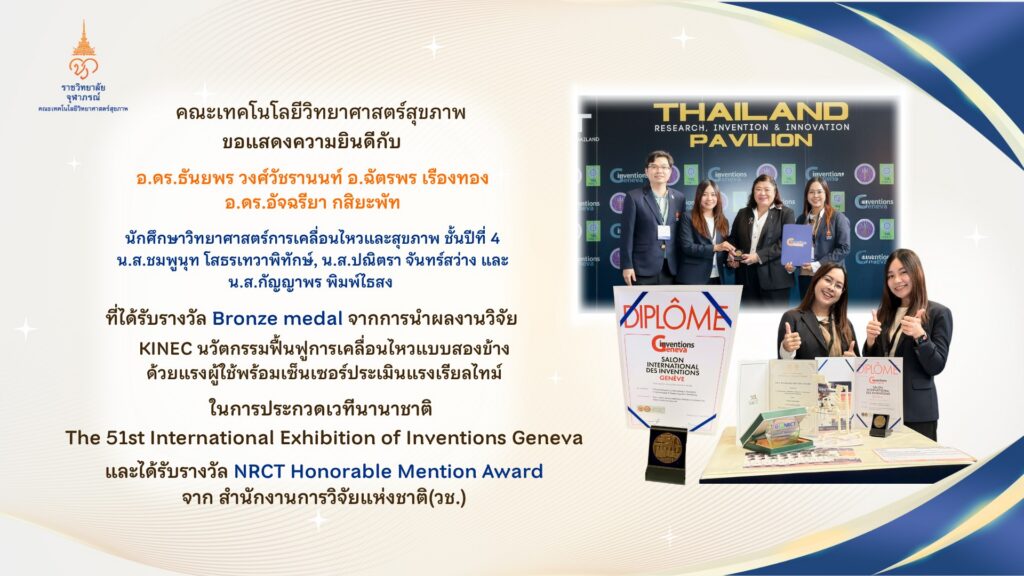 ขอแสดงความยินดี กับ ดร.ธันยพร วงศ์วัชรานนท์, อ.ฉัตรพร เรืองทอง, ดร.อัจฉรียา กสิยะพัท และนักศึกษาวิทยาศาสตร์การเคลื่อนไหวและสุขภาพ กับความสำเร็จในการคว้ารางวัล Bronze Medal