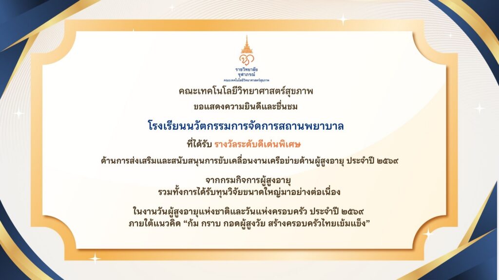 ขอแสดงความยินดี กับ โรงเรียนนวัตกรรมการจัดการสถานพยาบาล ในโอกาสที่ได้รับรางวัลระดับดีเด่นพิเศษ ด้านการส่งเสริมและสนับสนุนการขับเคลื่อนงานเครือข่ายด้านผู้สูงอายุ ประจำปี 2569